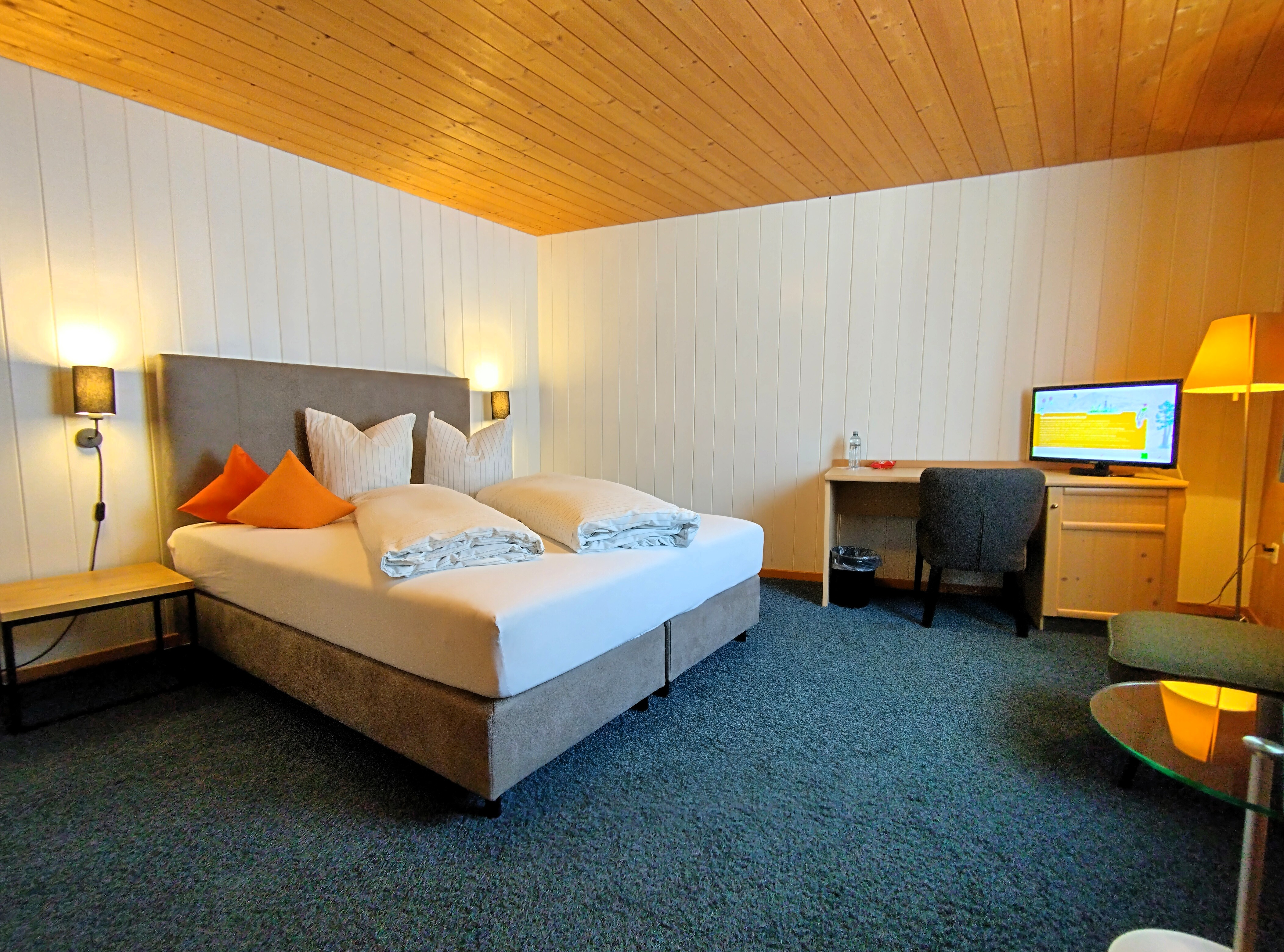 Doppelzimmer entweder mit Grand-lit - 200 cm x 180 cm, Doppelbetten - 200 cm x 180 cm oder 2 Einzelbetten - 200 cm x 90 cm, eigenes Badzimmer für 1 bis 2 Personen, Lavabo zum Teil separat im Zimmer, Flachbild-TV mit Kabelempfang, Safe, Heizung, Parkett- oder Teppichboden, Pult/Tisch und Stuhl, Nachttische und Schrank